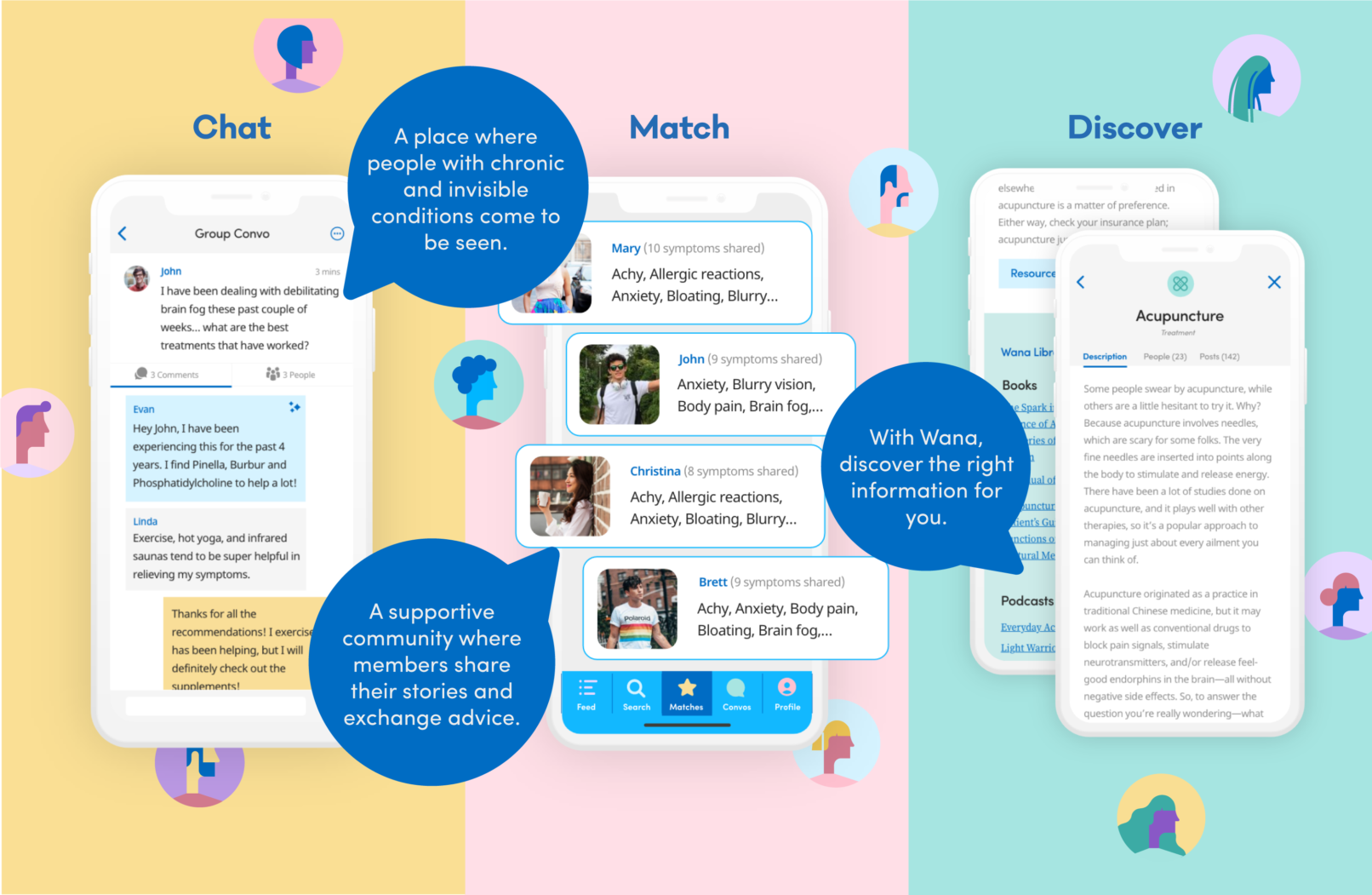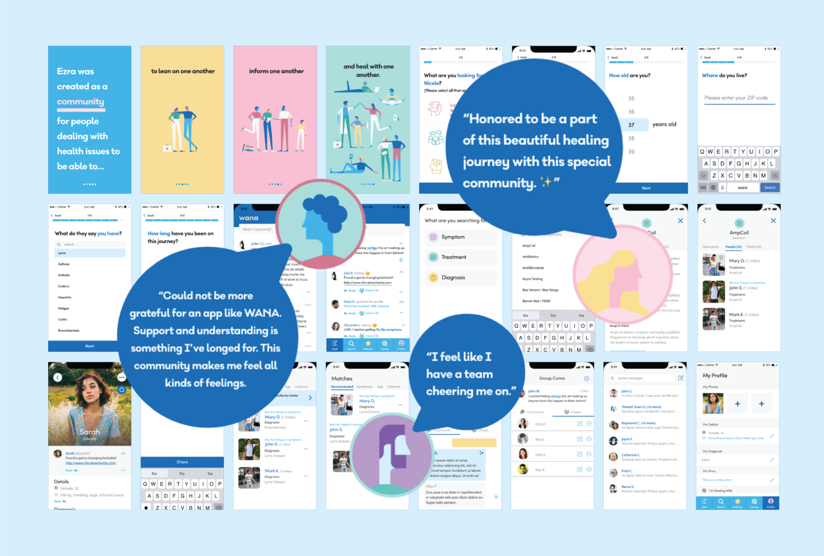 At Wana — We are not alone, my responsibilities were to reinvent the health community by creating an experience that included a safe space to talk, provide multiple ways to connect with others going through similar symptoms and diagnoses, and allow easy access to resources, bundled in a brand that gives people direction and hope.